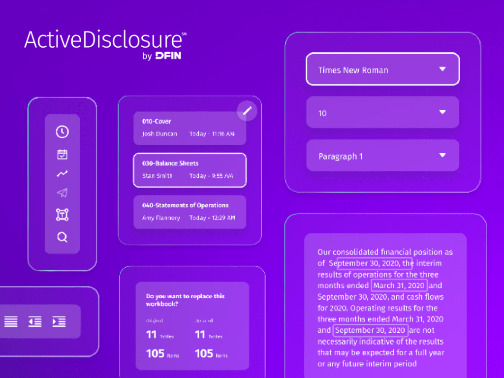 DFIN 专门为财报创建和SEC备案而开发的云端平台──ActiveDisclosure℠,针对上述痛点设计强大而完善的功能,为团队高效进行财报创建与合规备案工作赋能: