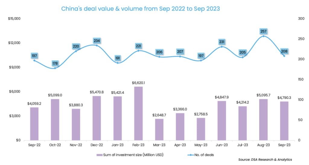 根据DFIN联手DealStreetAsia最新发布的《China Deals Barometer Report》报告,2023年9月,大中华区的创业融资活动略有放缓,共完成208笔交易,交易额为48亿美元。与8月相比,交易额与交易量分别下降了约6%和19.1%。尽管如此,与2022年同期相比,交易额仍然处于较高水平,上升了18%。