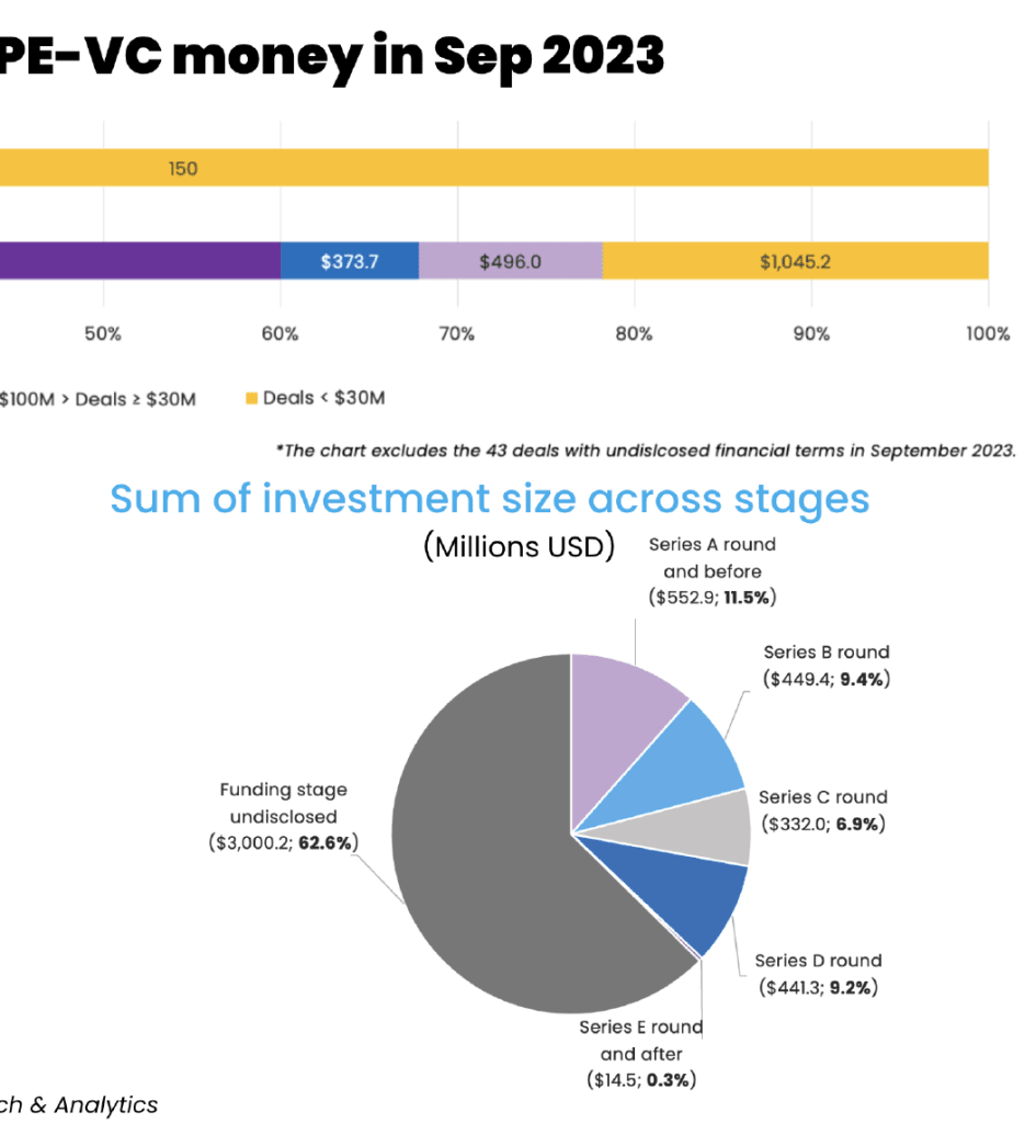 值得注意的是,9月份大中华区的四笔大型交易(即每笔交易额至少为1亿美元)共筹集了32亿美元,占该月份PE/VC融资总额的67.8%。