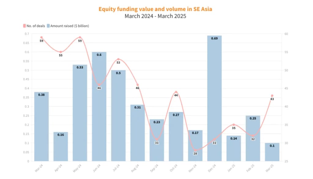 尽管3月东南亚股权融资交易数量从上月的32笔增长至43笔,但融资总额未能突破1亿美元门槛,环比(2.47亿美元)下降61%,同比(1.6亿美元)下降近38%。
