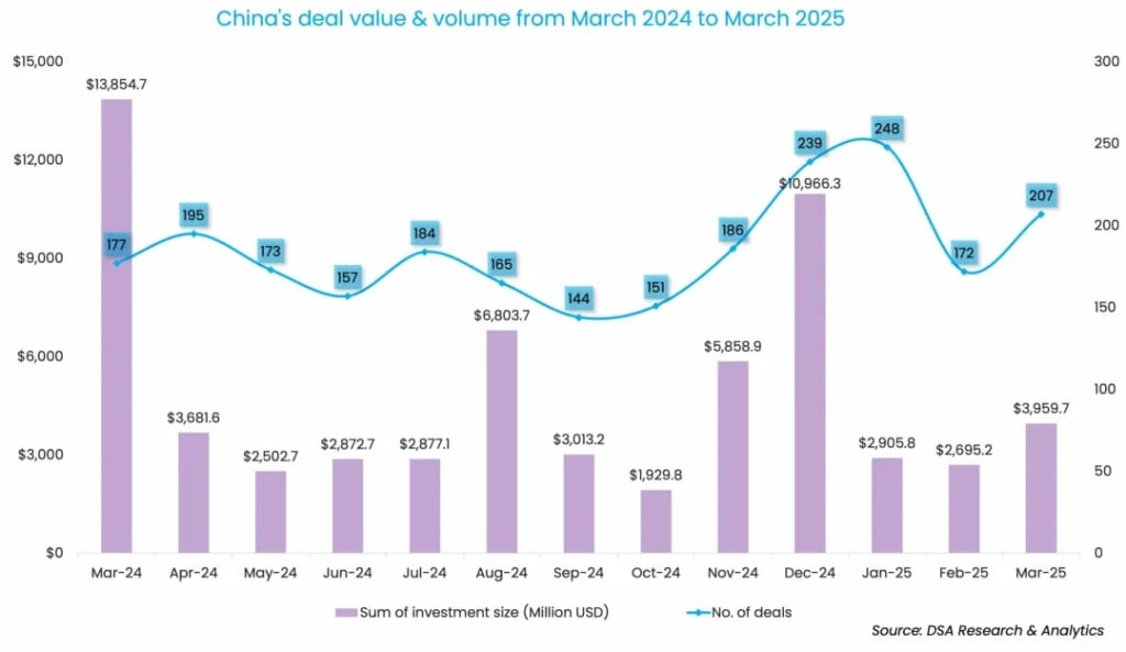 2025年3月份,中国初创企业共完成207笔私募股权和风险投资交易,融资规模达40 亿美元,尽管仍低于去年同期水平,但无论是交易量还是交易额较上月(172笔交易和27亿美元融资)均有提升。