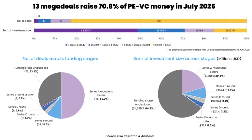 7月大中华区PE/VC市场共录得13笔大型交易(即每笔交易额至少为1亿美元),筹集逾47亿美元,占月融资总额70.8%。