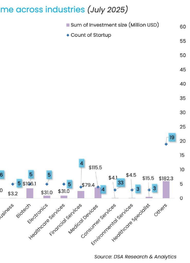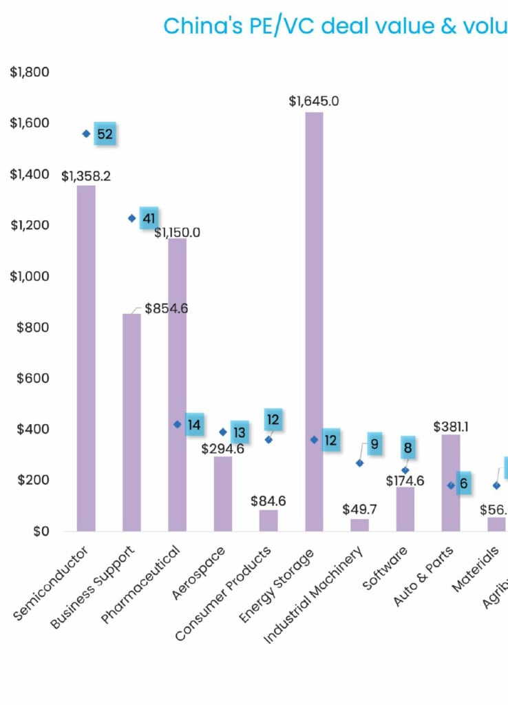 从大中华区各行业版块的投融资交易量来看,半导体以52笔交易在7月继续领先。其中,芯片制造领域贡献了3笔大型交易,包括中国全栈式AI芯片制造商曦望在新一轮融资中募得10亿元人民币(约1.393亿美元)。