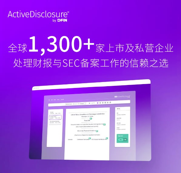 作为全美规模最大的SEC申报专业机构,当纳利金融服务集团(DFIN)常年为客户提供全面的合规解决方案。目前,DFIN ActiveDisclosure℠平台已成为全球1,300+家上市及私营企业处理财报与SEC备案工作的信赖之选。