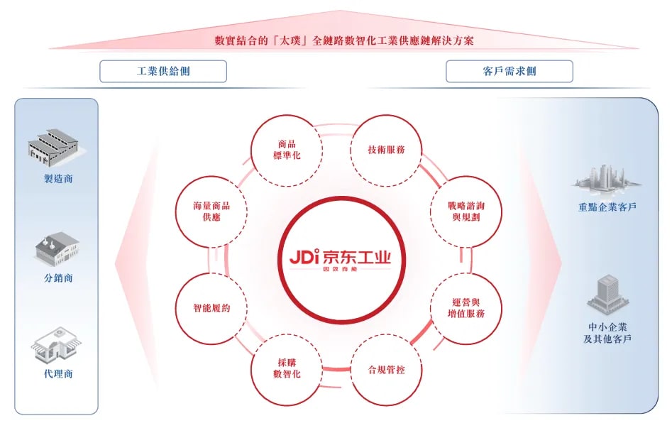 根据招股书,京东工业建有一套涵盖商品、采购、履约及运营的端到端供应链数智化基础设施,并在此之上构筑了数智与商品相结合的“太璞”全链路数智化工业供应链解决方案,为各行业、各规模的客户提供跨场景、跨品类的全面工业品供应以及技术与服务。