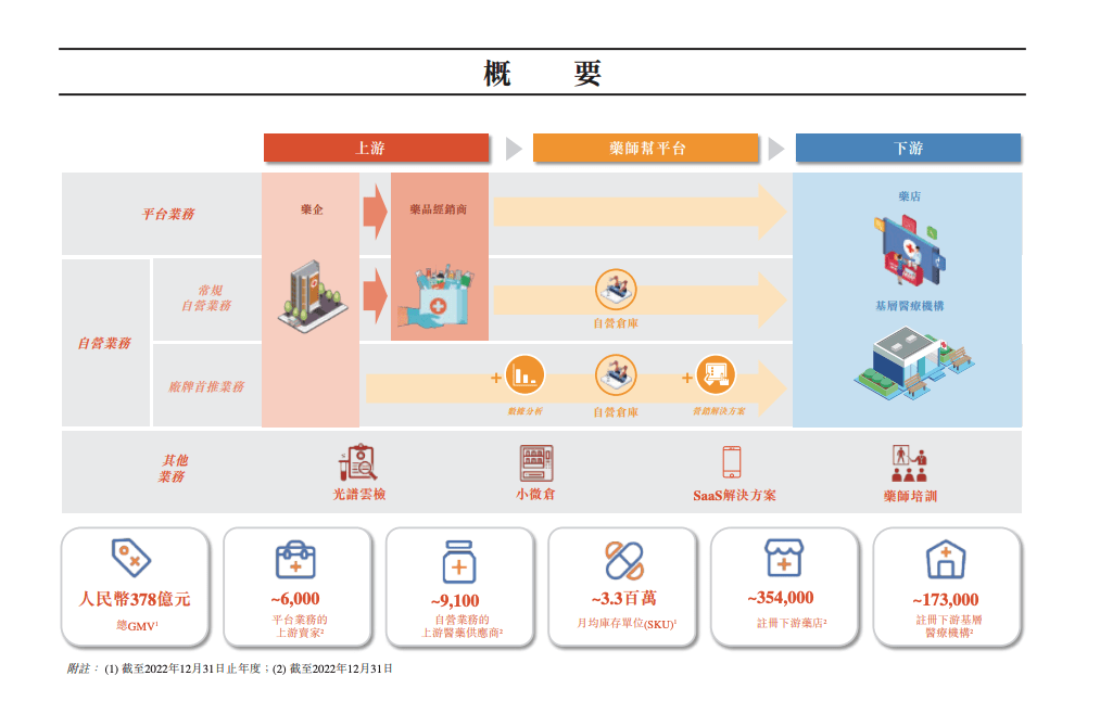 公司的业务模式以平台业务和自营业务为中心,并由一系列其他业务配合。平台业务,即构建一个供注册卖家及买家进行交易的数字化平台;自营业务,即通过产品销售产生收入;其他业务,包括了光谱云检、小微仓、SaaS解决方案、药师培训等。