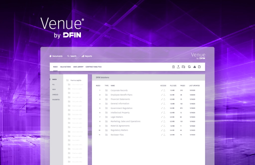 由DFIN开发的Venue®虚拟数据库具备强大的权限设置能力和企业级安全框架,并内置人工智能,是全球百强投行及其客户、顶尖私募股权、风险投资等机构在投融资交易过程中虚拟数据库的优先选择。 选择DFIN作为您的全球资本市场业务合作伙伴,关键时刻抓住机遇,从容推进交易。