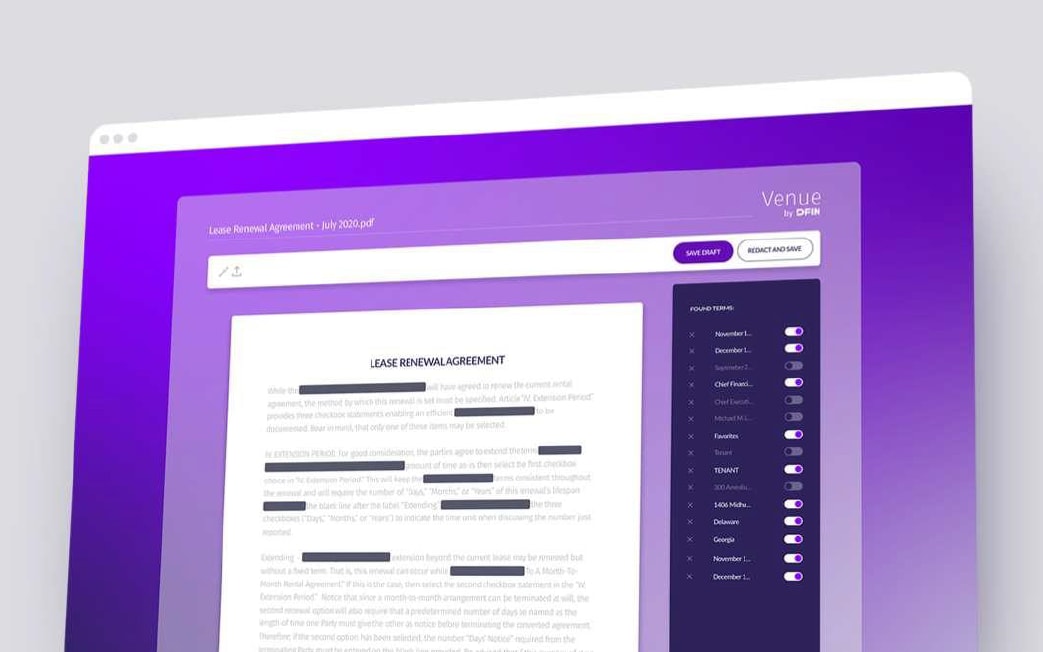 当纳利金融服务集团(DFIN)Venue®虚拟数据库具有多国语言界面、严格加密级别和领先的访问权限设置功能,能够确保生命科学公司在研发和业务开发生命周期的各个阶段,轻松与投资者、被许可人、合作伙伴共享敏感数据,同时进行严格的合规管理,助企业放心推进每个交易阶段的工作。