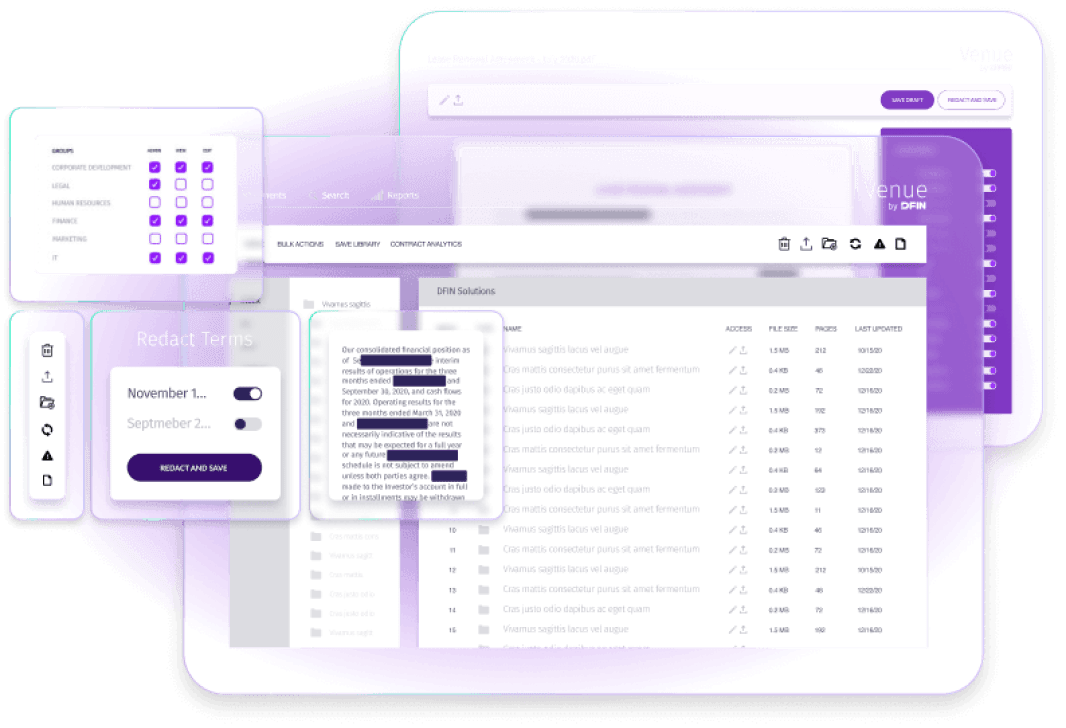 DFIN的顶尖专家团队和业界领先的并购交易软件解决方案能为您大幅提升并购交易项目的执行效率,缩短执行时间,降低执行成本,并助您实现交易价值的最大化。我们依赖科技和经验的力量,让交易流程化繁为简,并为跨时空的无缝协同合作提供支持,让您和团队得以从容执行企业并购交易的每一个关键环节。
