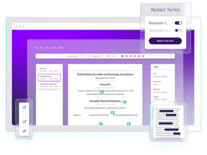 在简化投资者报告流程的同时严格保持合规性。ActiveDisclosure让您的各个团队能够跨部门、跨职能和跨地点进行无缝协作。只需通过Microsoft Word,即可在交易的各个关键环节协同创建和共享信息和文档。